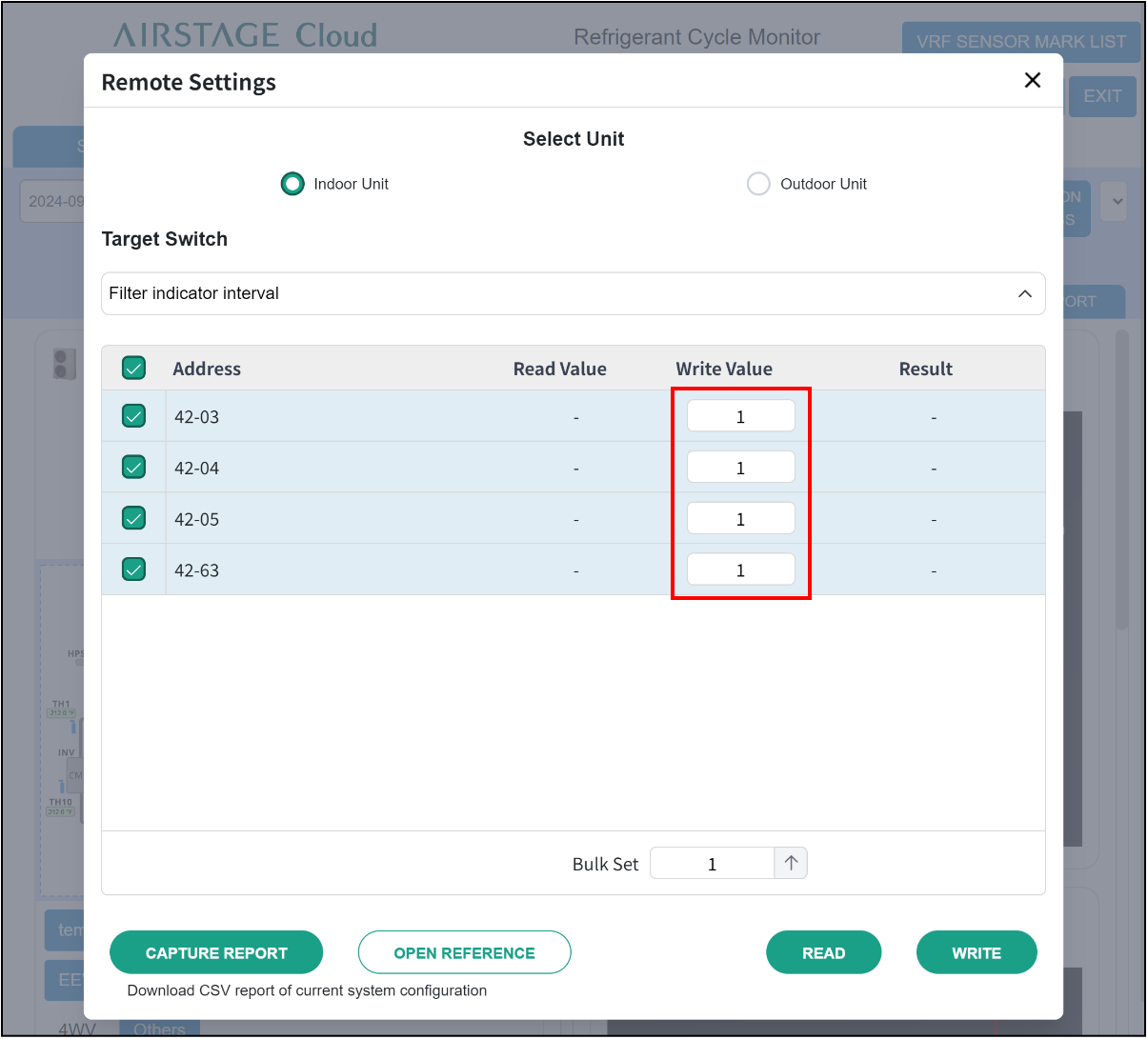 Inoltre, “Bulk Set” nella parte inferiore della schermata può essere utilizzato per inserire lo stesso valore per tutte le unità di destinazione mentre ne è selezionato un numero maggiore.