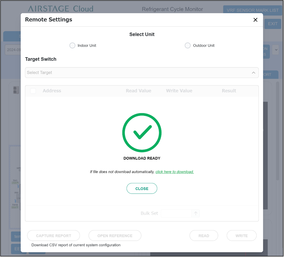 - La funzione “CAPTURE REPORT” può essere utilizzata per emettere il valore corrente dell’impostazione delle funzioni per tutte le unità interne ed esterne e controllarle tutte collettivamente.