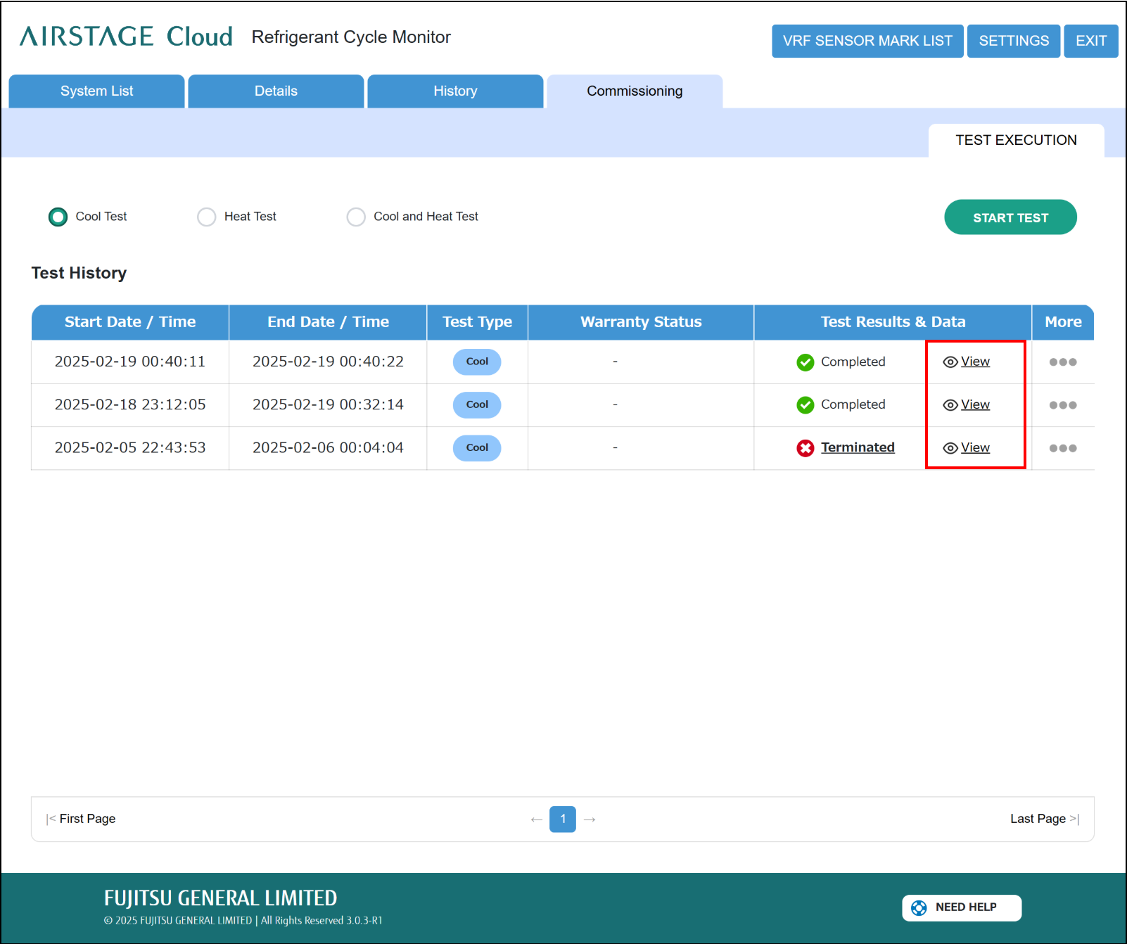 Toccare il pulsante “View” per controllare lo stato del ciclo di refrigerazione durante il tempo di esecuzione del test. (Si apre una scheda separata del browser.)