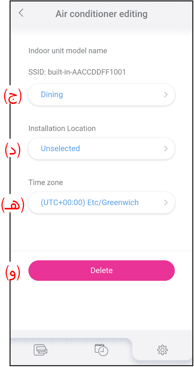 (يمكن تغيير وضع التحكم في."Environment setting (إعداد البيئة)").(د) Installation Location انقر لتحديد موقع تركيب مكيف الهواء. (هـ) Time zone انقر لتحديد المنطقة الزمنية التي يتم فيها تركيب مكيف الهواء. يعمل المؤقت الأسبوعي ومؤقت الوحدة الخارجية المنخفضة الضجيج وفقاً لهذا الإعداد. (و) زر [Delete] انقر لحذف مكيف الهواء المسجل من حسابك. إذا قمت بالنقر على هذا الزر، فستظهر رسالة تأكيد.