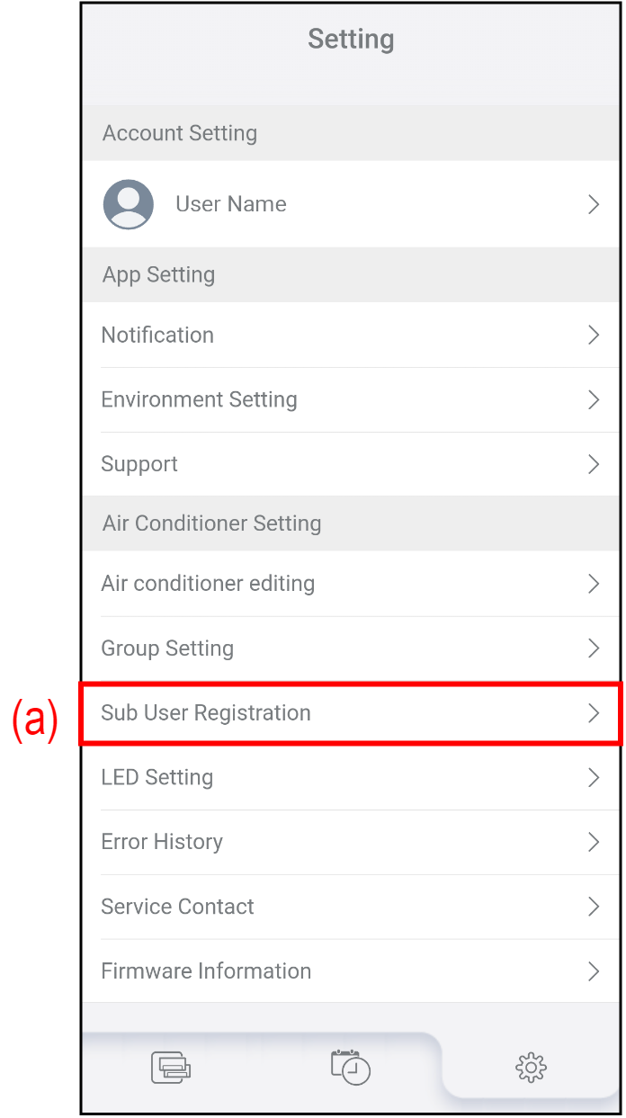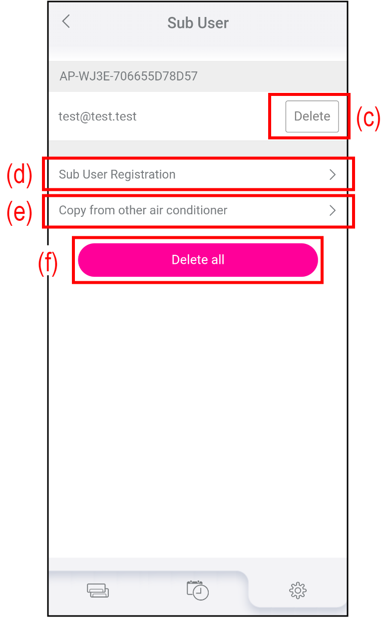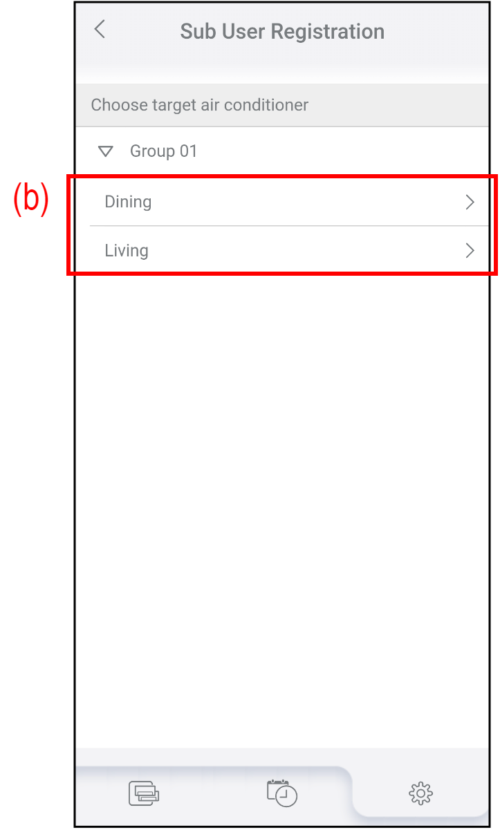 Klepnutím na (b) vyberte klimatizaci, ke které chcete přidat nebo odstranit dílčího uživatele.
