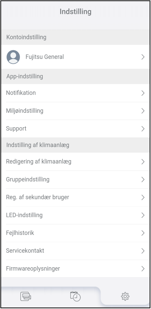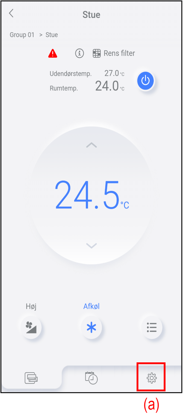 Du kan tjekke og ændre de forskellige indstillinger for denne app eller klimaanlæggene på fanen Indstillinger [