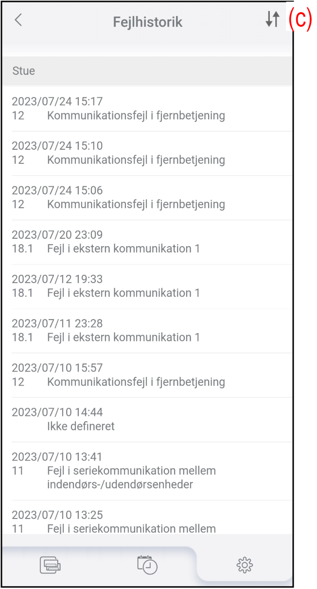 - Fejlhistorikken for klimaanlægget vises i rækkefølgen fra nyest til ældst.