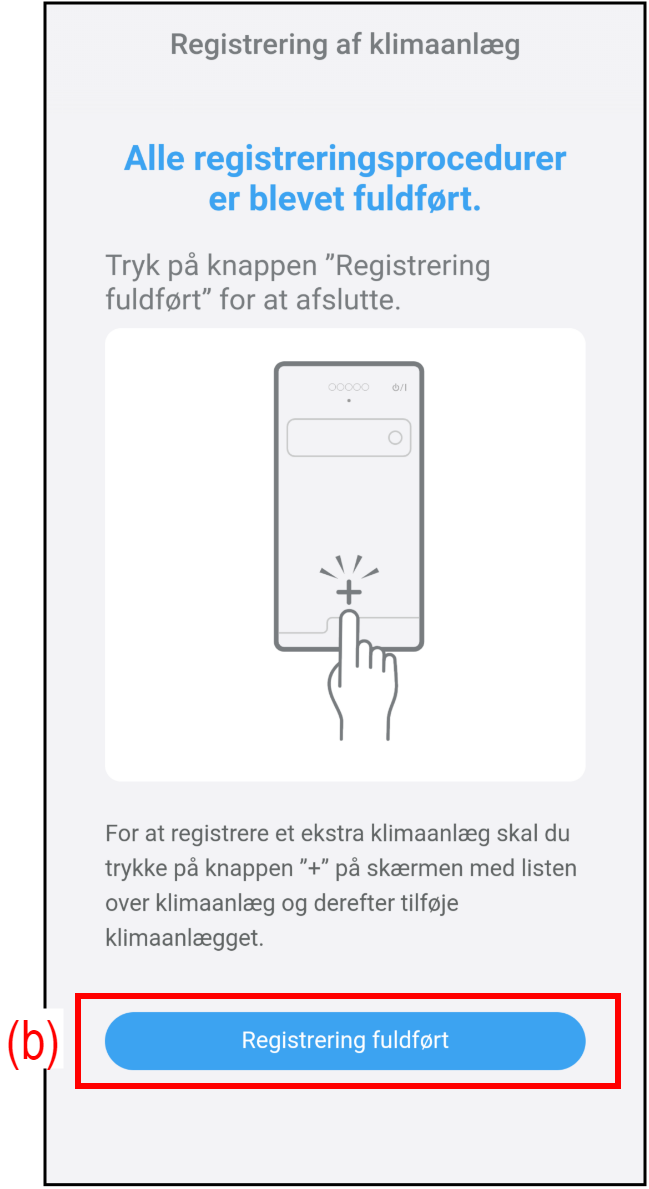 Når registreringen er gennemført, vises følgende skærmbillede. - Tryk på knappen (b) for at fuldføre registreringen.