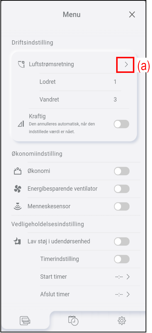 Tryk på (a) for at tilpasse op/ned-retningen af luftstrømmen.