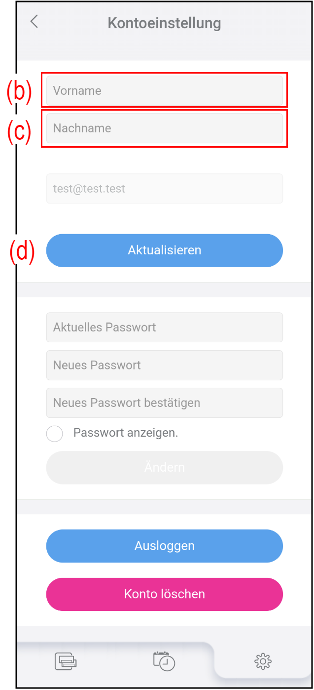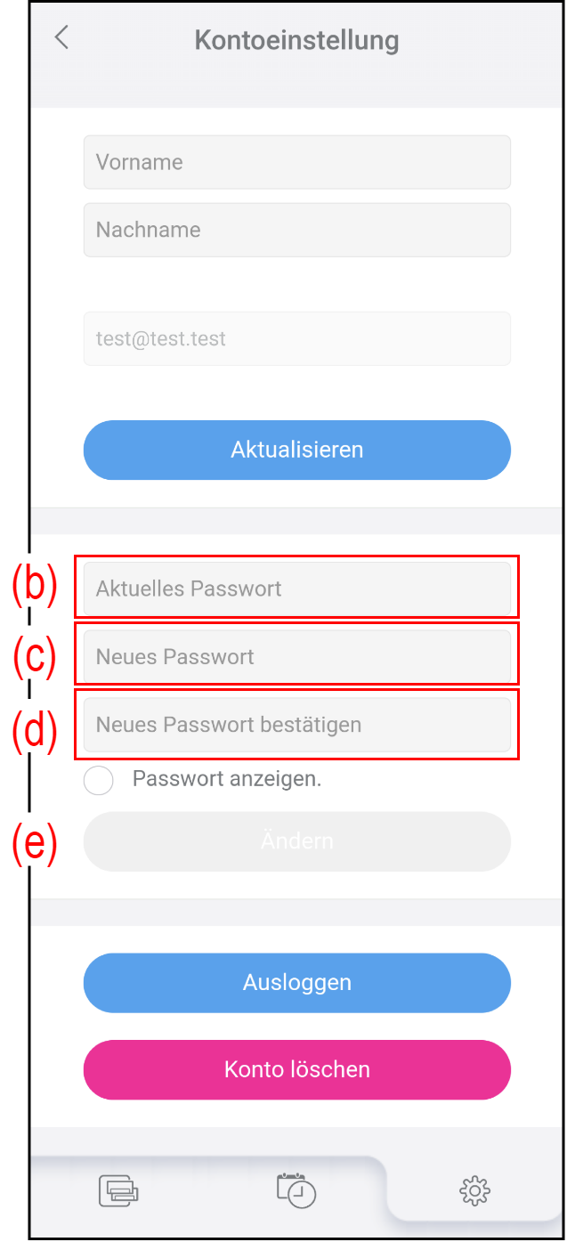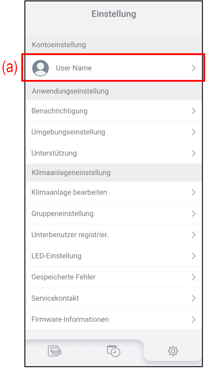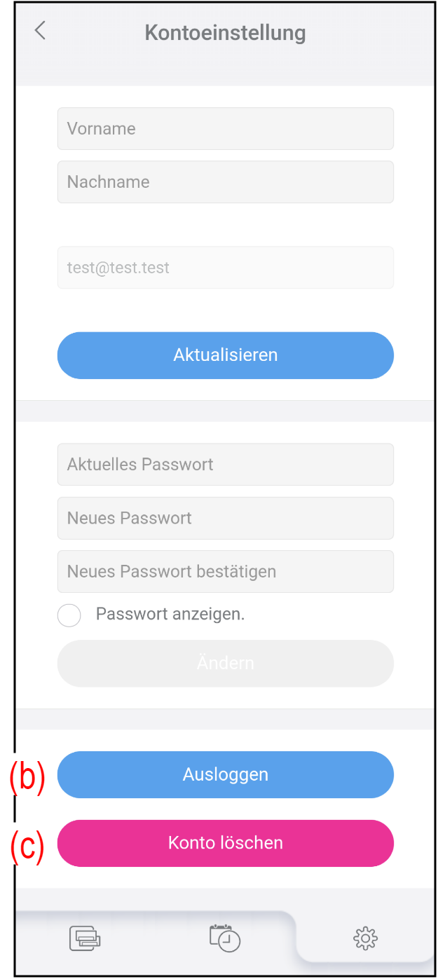 Tippen Sie auf dem Bildschirm „Einstellungen“ auf (a), um Ihre Kontoinformationen und Ihr Passwort zu ändern.