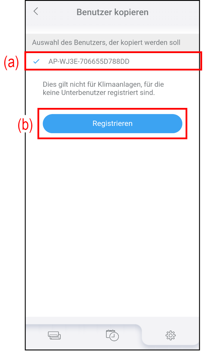 - Wählen Sie auf dem Bildschirm „Benutzer kopieren“ die Klimaanlage (a) aus, von der Sie die Unterbenutzereinstellung kopieren möchten.