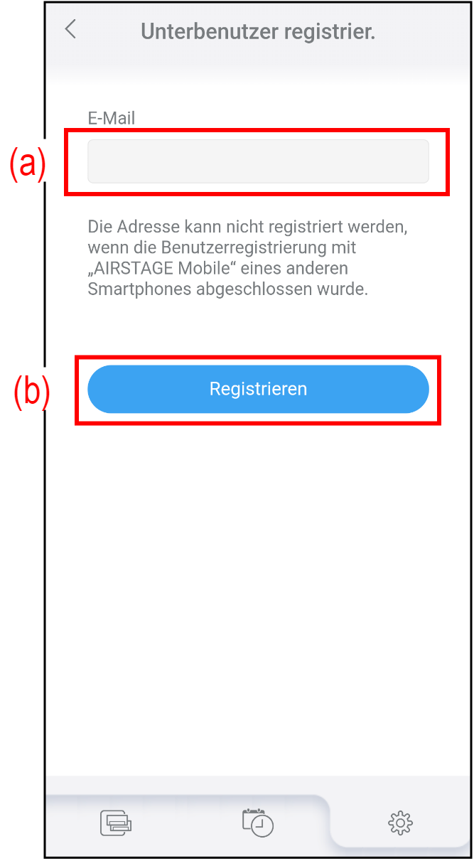 * Die E-Mail-Adresse muss ein gültiges AIRSTAGE Mobile Konto sein. Stellen Sie sicher, dass Sie AIRSTAGE Mobile installieren und die Kontoerstellung mit dem Smartphone des Unterbenutzers im Voraus abschließen.