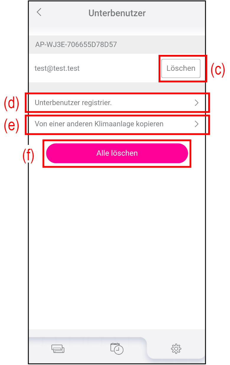 Um alle für die Klimaanlage registrierten Unterbenutzer zu löschen, tippen Sie auf (f).