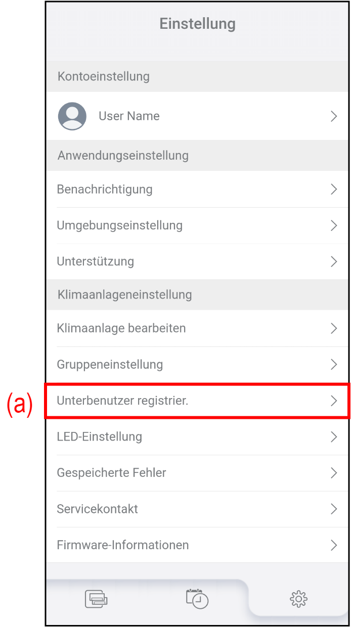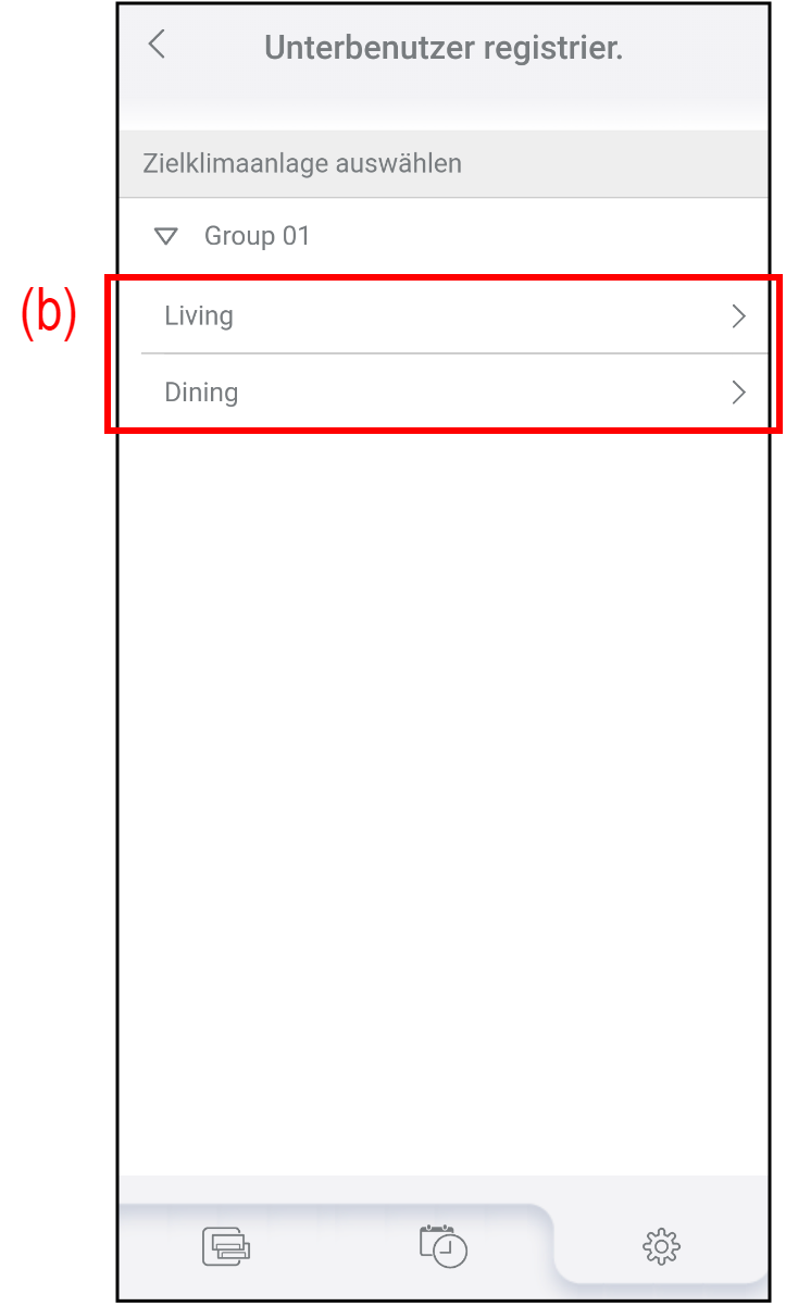 Tippen Sie auf (b), um die Klimaanlage auszuwählen, zu der Sie den Unterbenutzer hinzufügen oder löschen möchten.