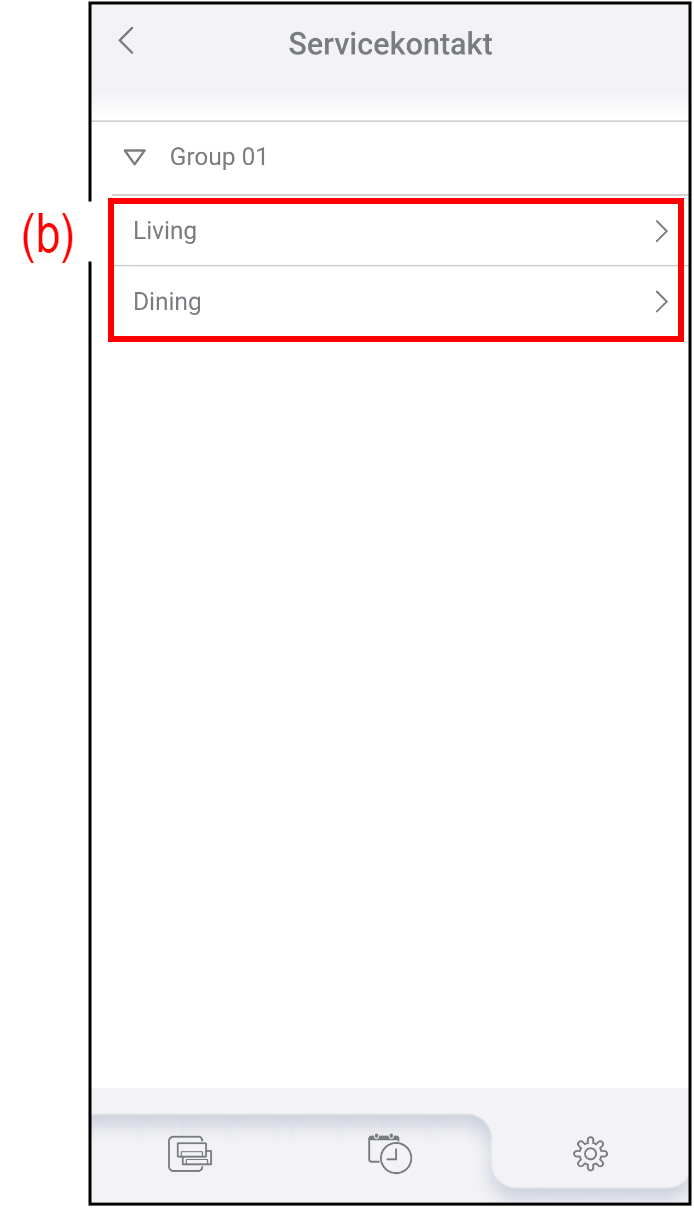 - Tippen Sie auf (b), um die zu prüfende Klimaanlage zu wählen oder die Informationen zum Servicekontakt zu überprüfen oder zu bearbeiten.