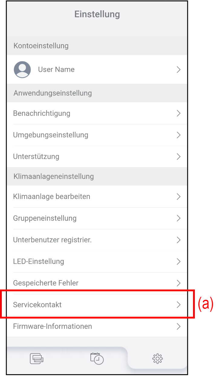 - Tippen Sie auf dem Bildschirm „Einstellungen“ auf (a), um die Informationen zum Servicekontakt zu überprüfen oder zu bearbeiten.