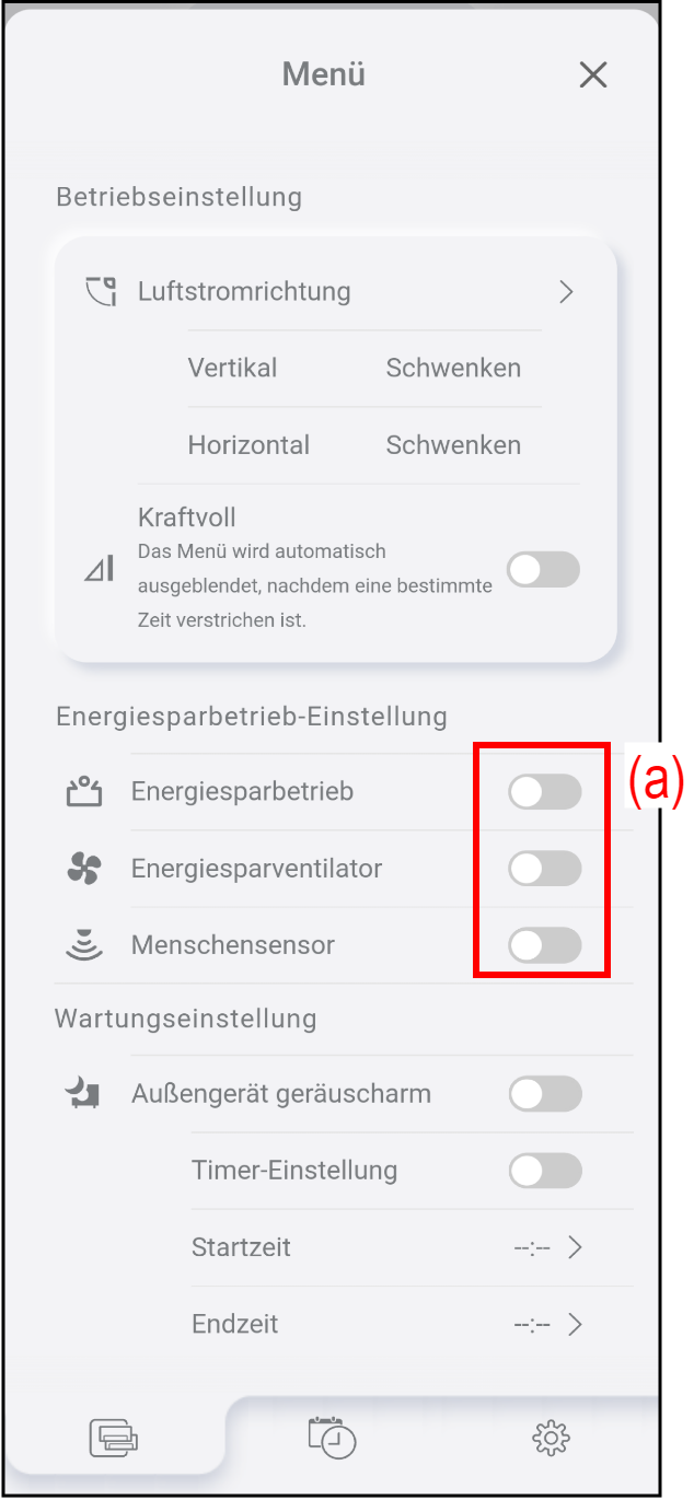 Tippen Sie auf (a), um jeden Betrieb zu aktivieren/deaktivieren.