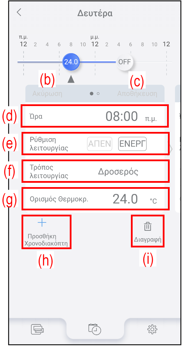 Για να επεξεργαστείτε τις ρυθμίσεις χρονοδιακόπτη, πατήστε τα στοιχεία (d) έως (g). Μετά, πατήστε (c) για να αποθηκεύσετε τις ρυθμίσεις.