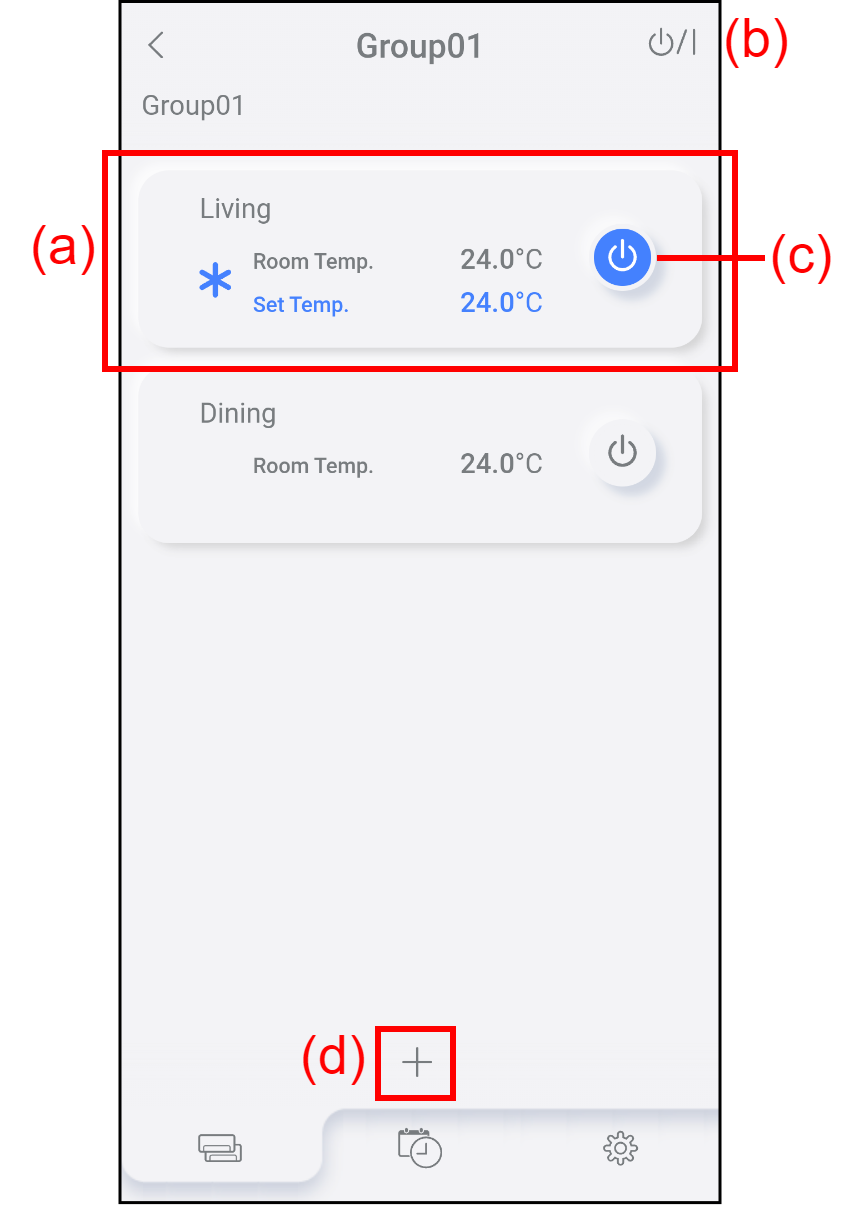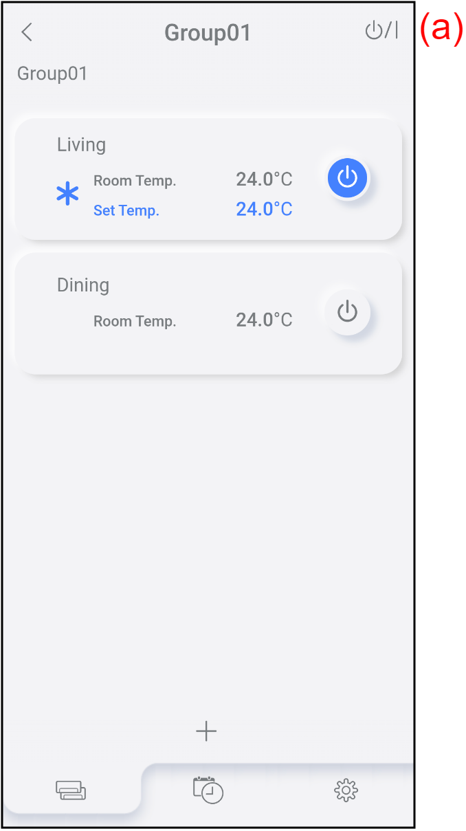 Tap (b) to start/stop the operation of all air conditioners in the group. Refer to "All start/stop operation" below for details.