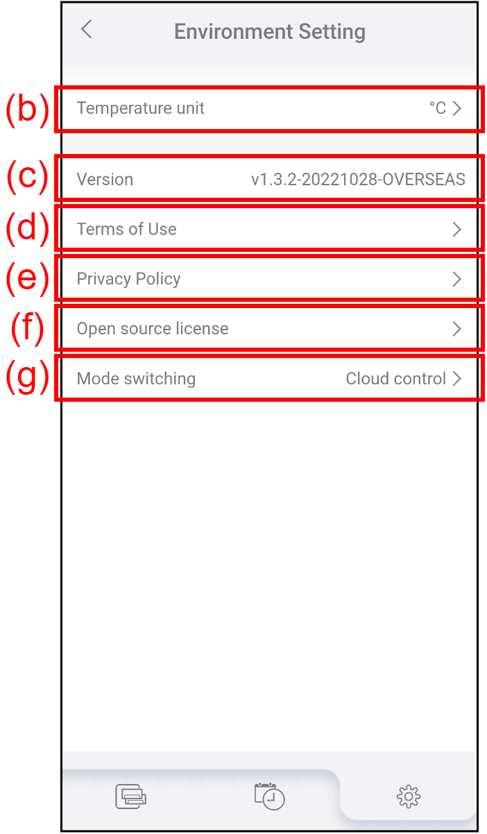 (c) Version It shows the current version of AIRSTAGE Mobile. (d) Terms of Use Tap to check the latest Terms of Use for AIRSTAGE Mobile. (e) Privacy Policy Tap to check the latest Privacy Policy for AIRSTAGE Mobile. (f) Open source license Tap to check the open-source licenses used in AIRSTAGE Mobile. *The open-source licenses are shown only in English. (g) Mode switching Tap to switch the control mode (Cloud control or Direct control.)