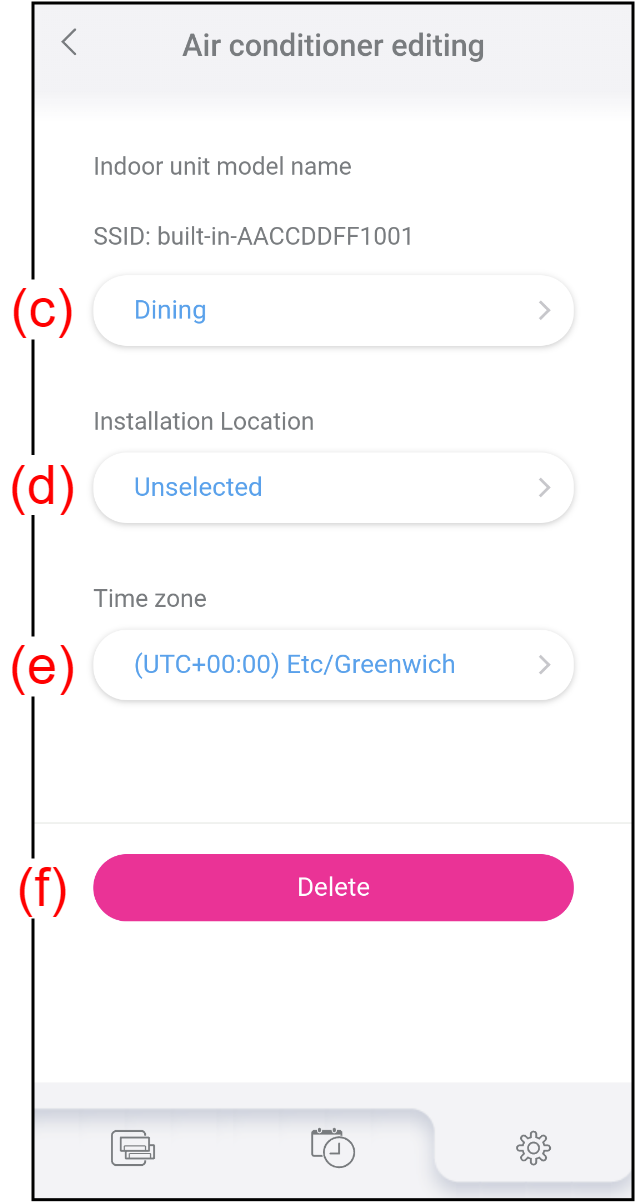(The control mode can be changed in "Environment setting".)(d) Installation Location Tap to select the installation location of the air conditioner. (e) Time zone Tap to select the time zone where the air conditioner is installed. The Weekly timer and the Outdoor unit low noise timer work according to this setting. (f) [Delete] button Tap to delete the registered air conditioner from your account. If you tap this button, a confirmation message appears.