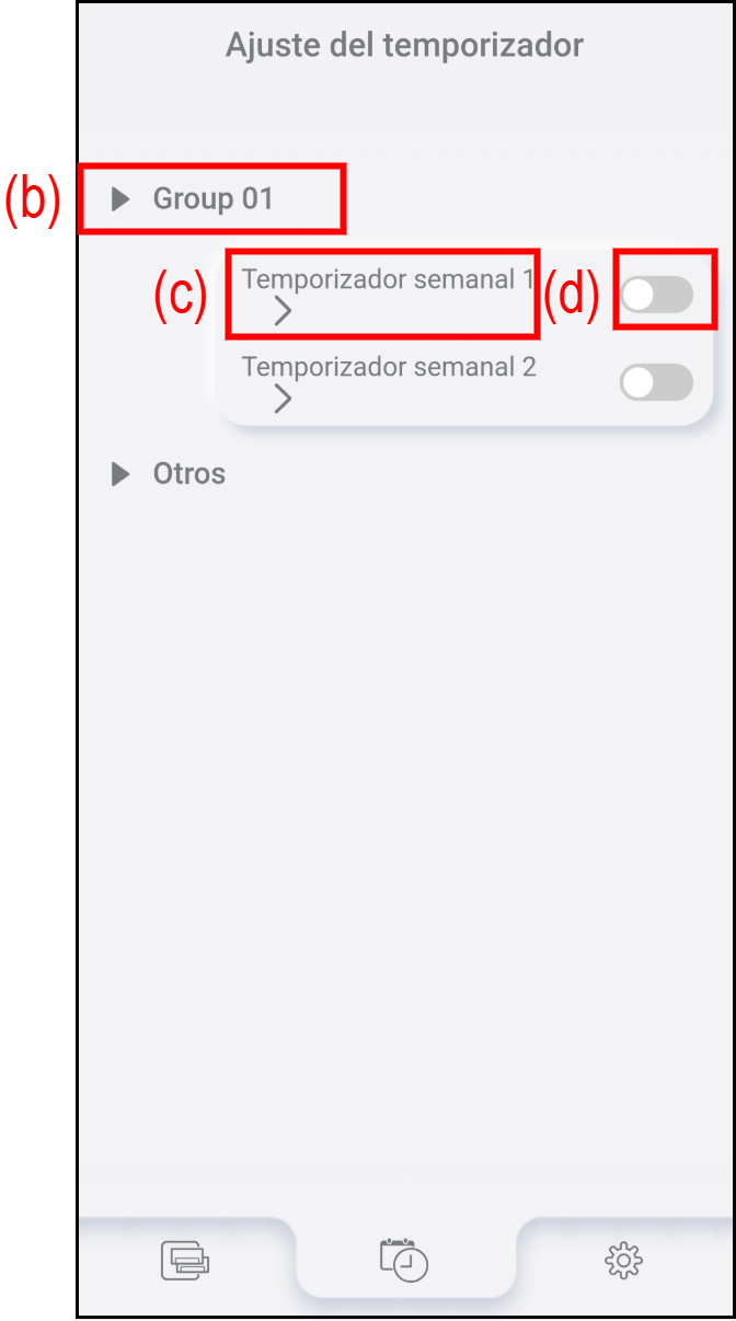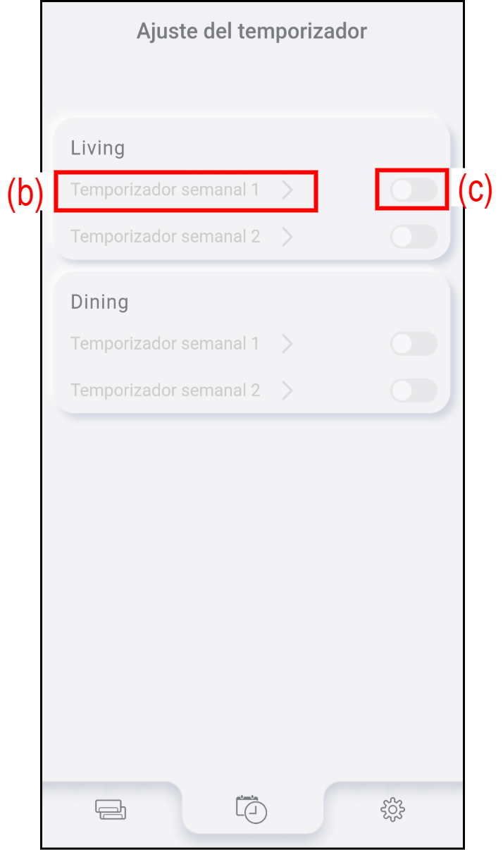Toque (c) para activar/desactivar el temporizador semanal.