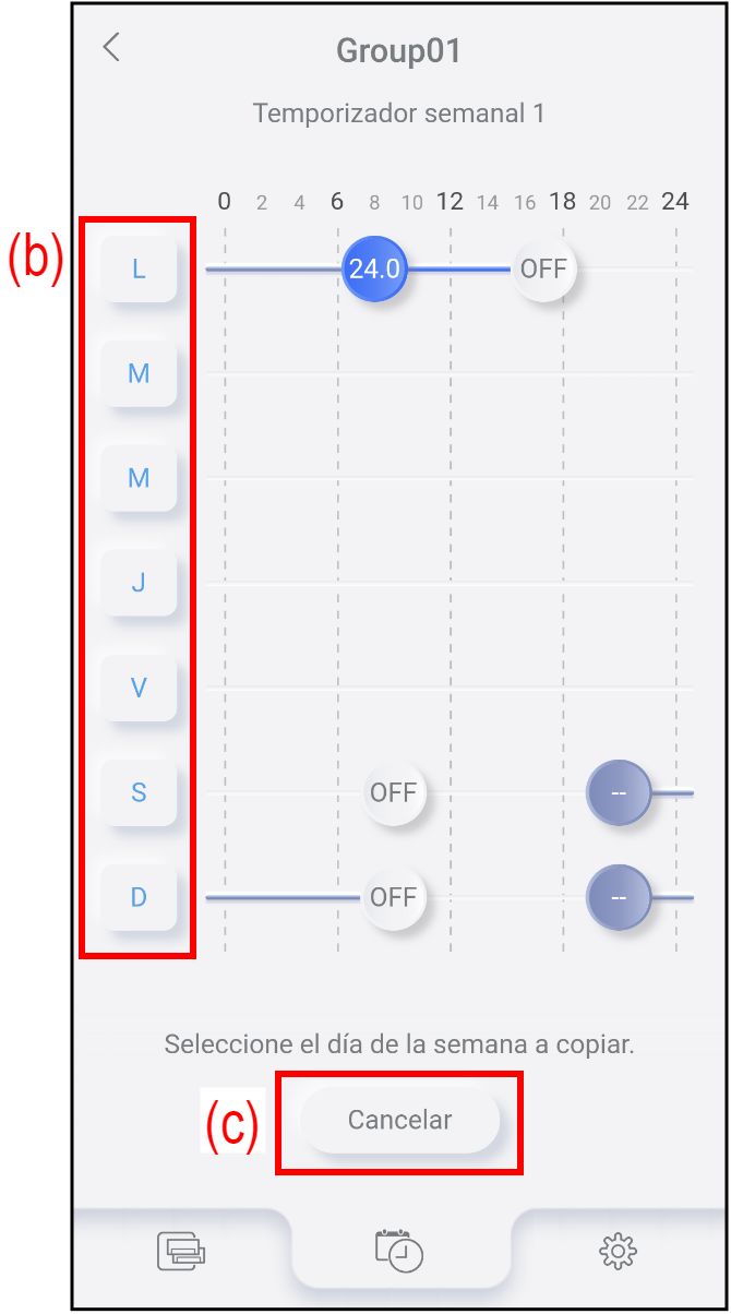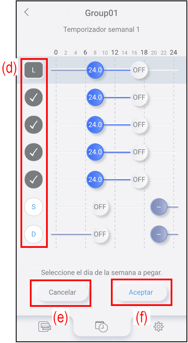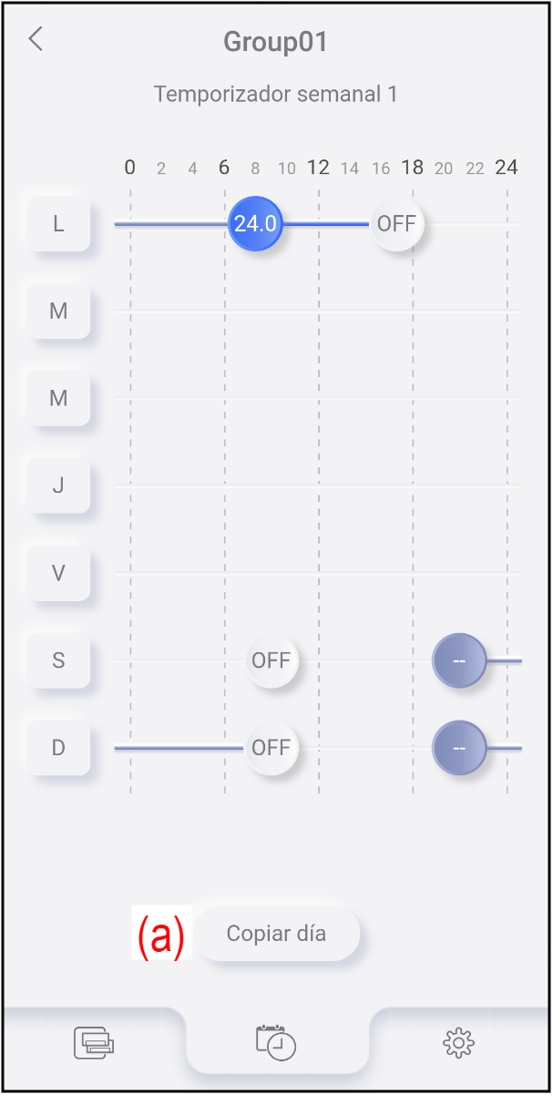 - Toque (a) en la pantalla de ajustes del temporizador semanal.