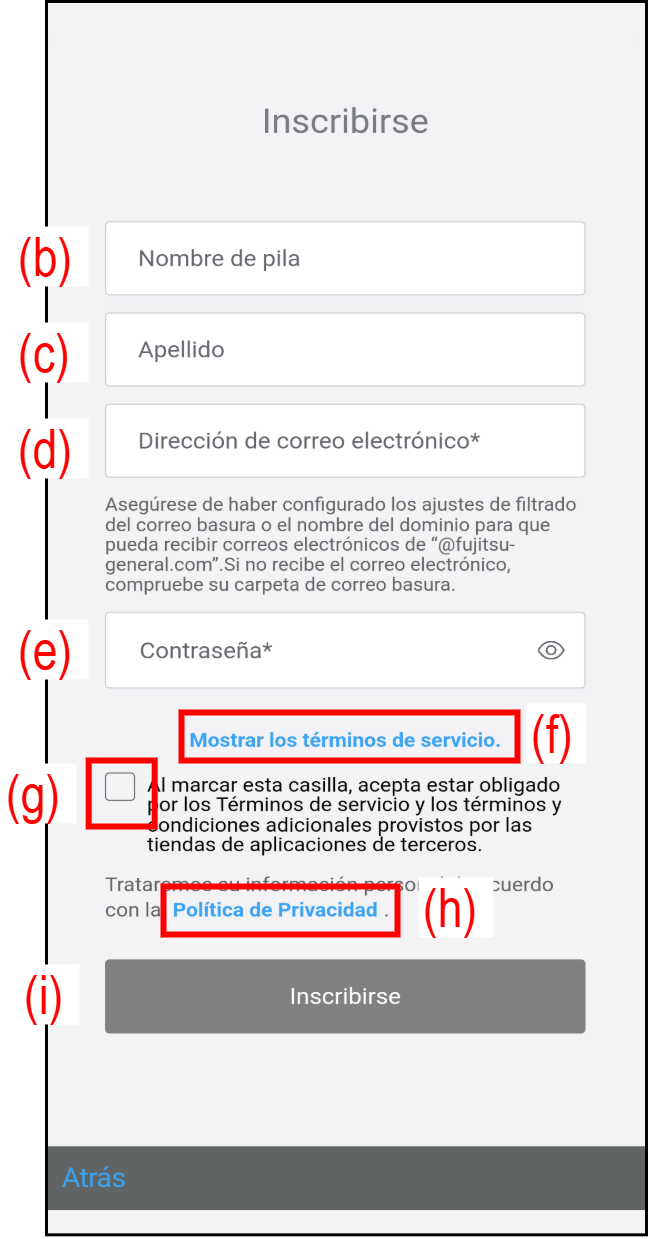 (b) Nombre de pila Introduzca su nombre. (c) Apellido Introduzca su apellido. (d) Dirección de correo electrónico Introduzca su dirección de correo electrónico. Esto se utilizará como el ID de su cuenta.