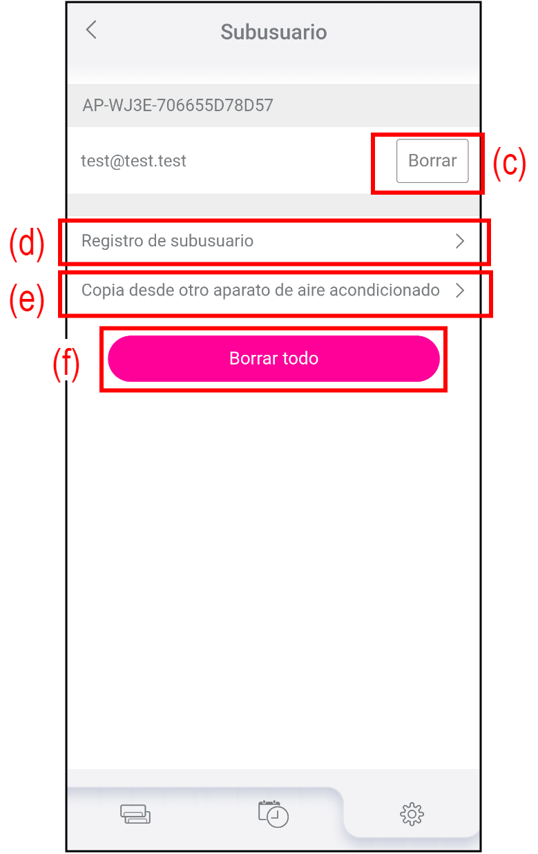 Para eliminar todos los subusuarios registrados en el aire acondicionado, toque (f).