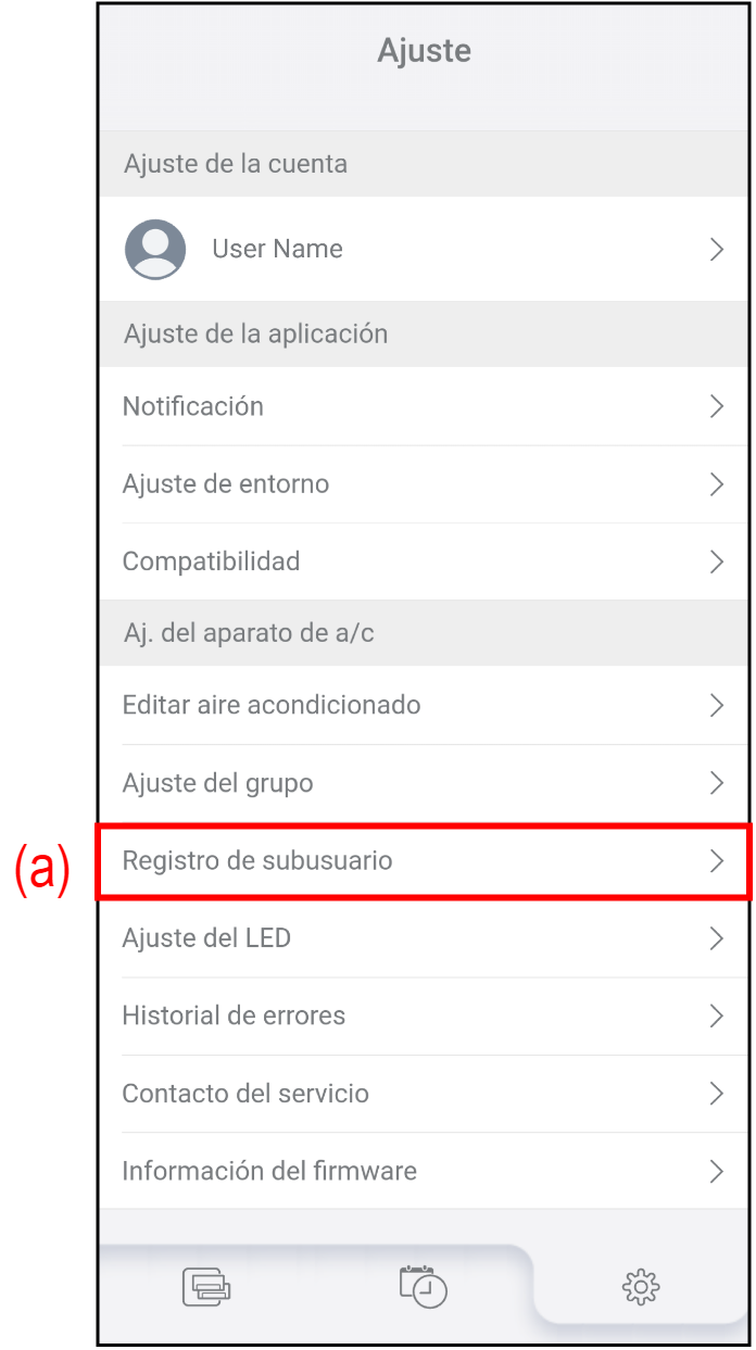 Puede registrar o eliminar los subusuarios que puedan manejar los aparatos de aire acondicionado.