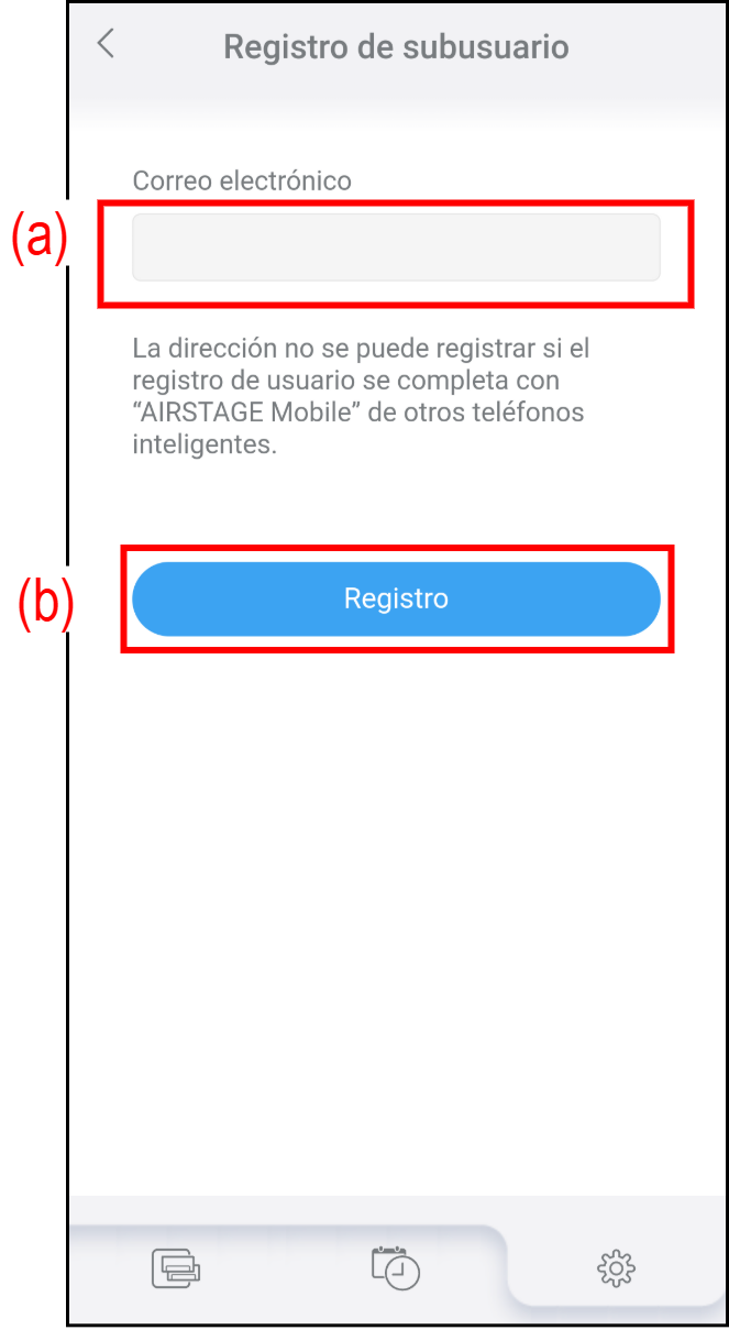 * La dirección de correo electrónico debe ser una cuenta válida de AIRSTAGE Mobile. Asegúrese de instalar AIRSTAGE Mobile y completar la creación de la cuenta con el smartphone del subusuario previamente.