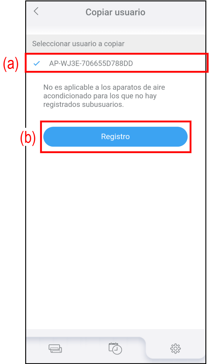 - Seleccione el aire acondicionado (a) del que desea copiar la configuración del subusuario en la pantalla "Copiar usuario".