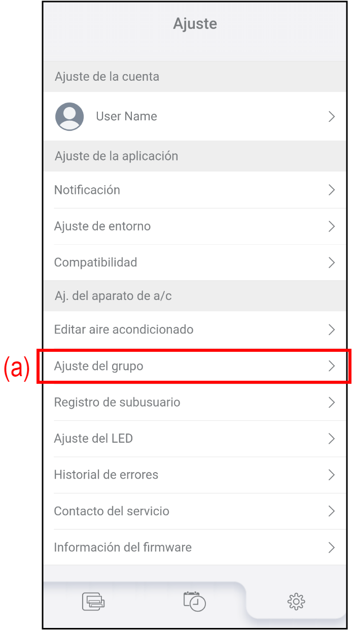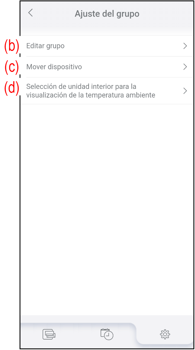 (b) Editar grupo Toque para crear un nuevo grupo, editar el nombre del grupo o eliminar el grupo. Consulte "Editar grupo" para obtener más información. (c) Mover dispositivo Toque para trasladar aparatos de aire acondicionado a otro grupo.