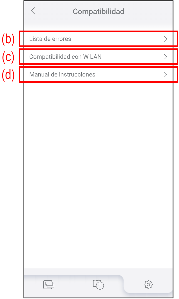 | (c) | Compatibilidad con W-LAN | Puede acceder a asistencia de ajuste de WLAN en nuestro sitio web. |