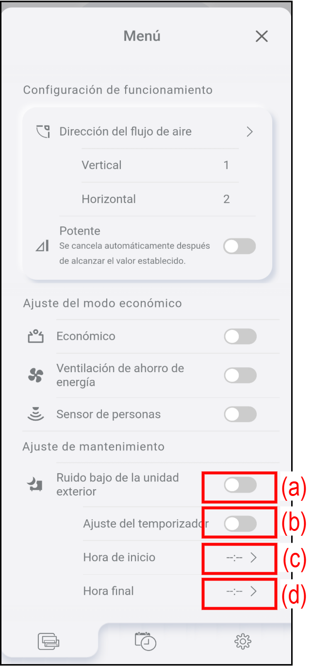 | (d) | Hora final | Toque para ajustar la hora de finalización del temporizador de ruido bajo de la unidad exterior. El ruido bajo de la unidad exterior se detiene a la hora ajustada. |