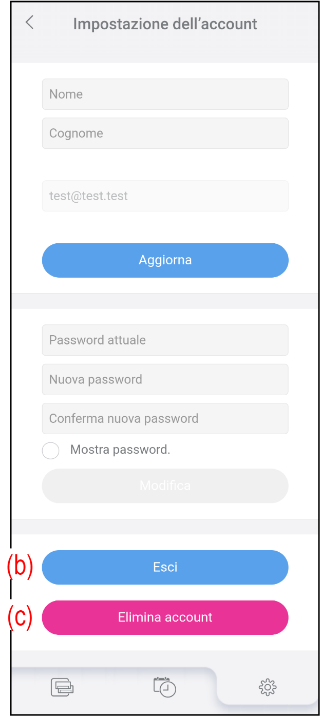 Per eliminare il proprio account da questa app e dal server AIRSTAGE Cloud, toccare il pulsante (c).
