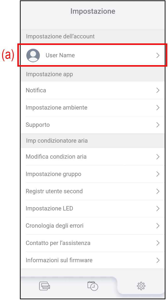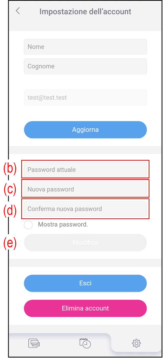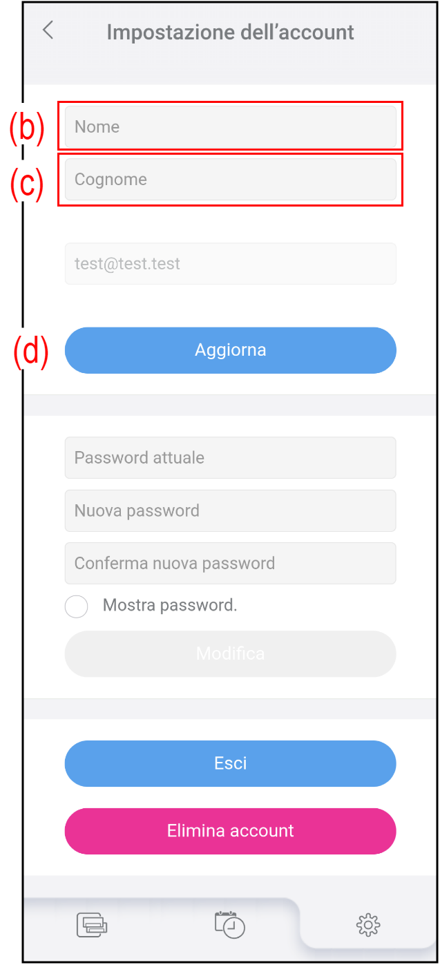 Toccare (a) sulla schermata "Impostazione" per modificare dati e password del proprio account.