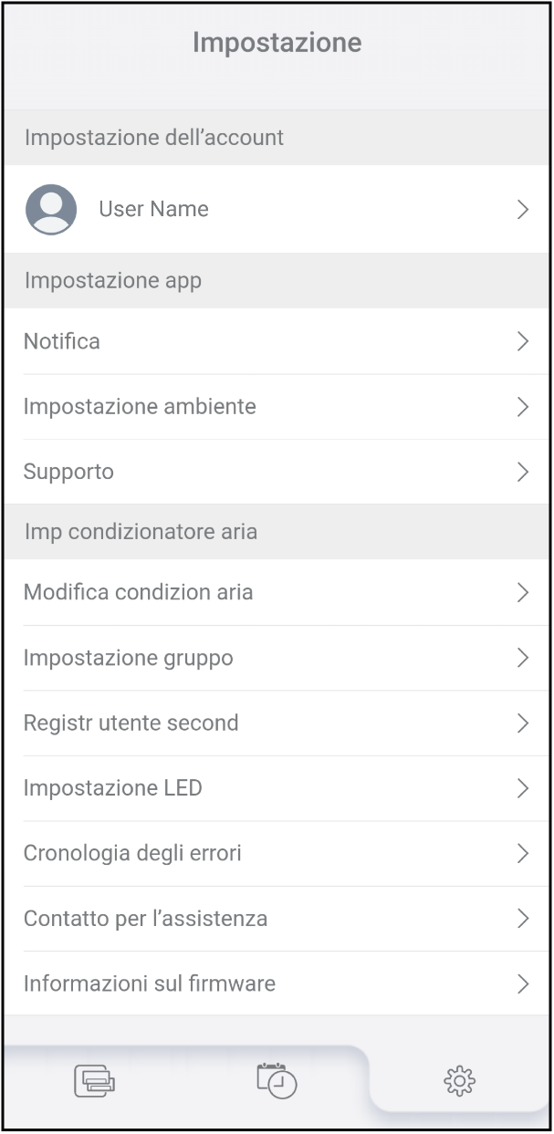 È possibile controllare e modificare le varie impostazioni per l’app o per i condizionatori d’aria dalla scheda Impostazioni [