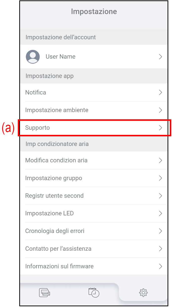 Toccare (a) sulla schermata "Impostazione" per verificare le informazioni di supporto.