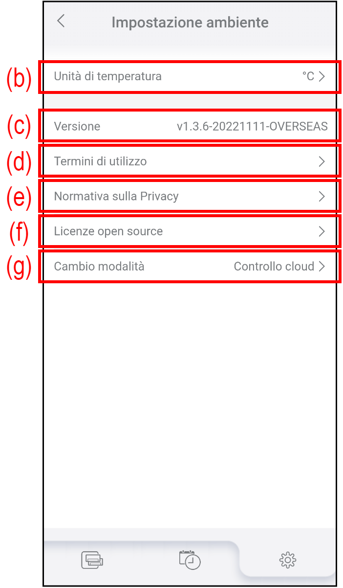 (c) Versione Mostra la versione attuale dell’AIRSTAGE Mobile. (d) Termini di utilizzo Toccare per controllare i Termini di utilizzo più recenti per l’AIRSTAGE Mobile. (e) Informativa sulla privacy Toccare per controllare l’Informativa sulla privacy più recente per l’AIRSTAGE Mobile. (f) Licenza Open source Toccare per controllare le licenze open source utilizzate in AIRSTAGE Mobile. *Le licenze open source sono consultabili solo in inglese. (g) Cambio modalità Toccare per cambiare la modalità di controllo (controllo cloud o controllo diretto.)