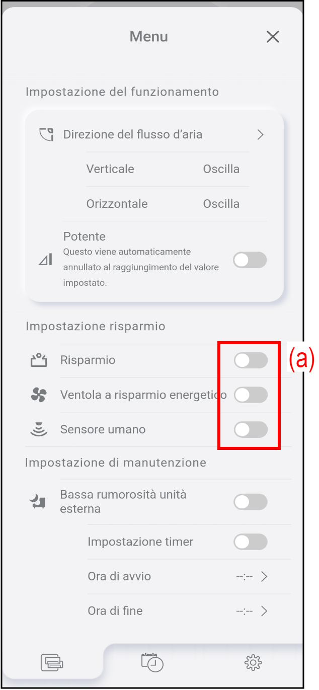 Toccare (a) per attivare/disattivare ciascun funzionamento.