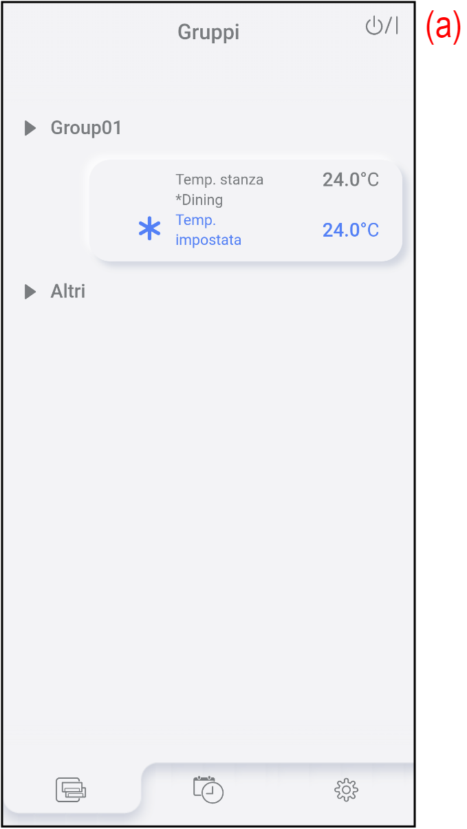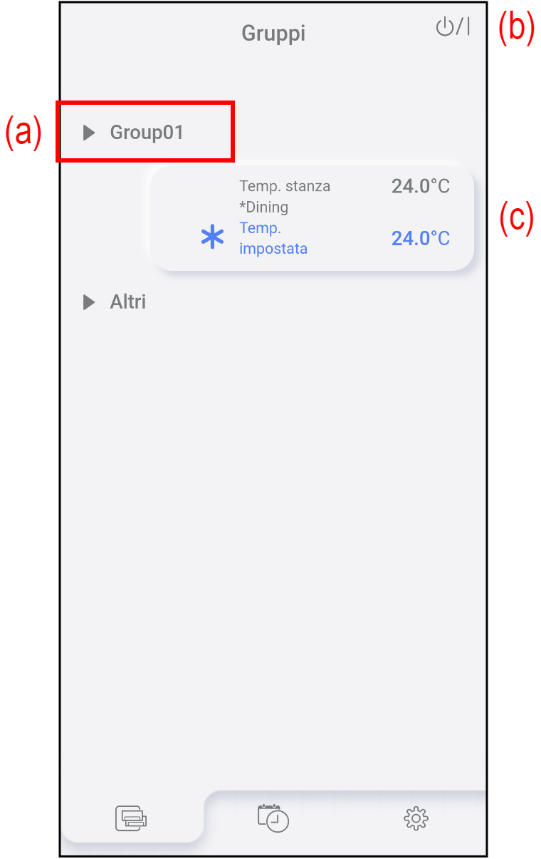 | (a) | Nome del gruppo | Per controllare l’elenco dei condizionatori d’aria nel gruppo, toccare qui. Fare riferimento a "Schermata Elenco condizionatori d'aria" per informazioni dettagliate. |
