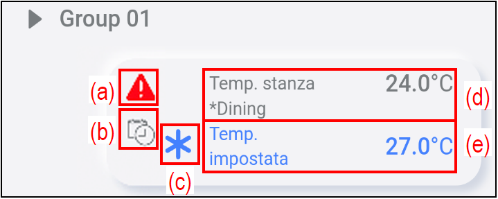 | (d) | Temp. stanza | Mostra l’unità interna rappresentativa e la temperatura della stanza misurata dall’unità interna rappresentativa. È possibile impostare l’unità interna rappresentativa dalla scheda Impostazioni > "Impostazione gruppo" > "Selezione dell’unità interna del display temperatura ambiente". |