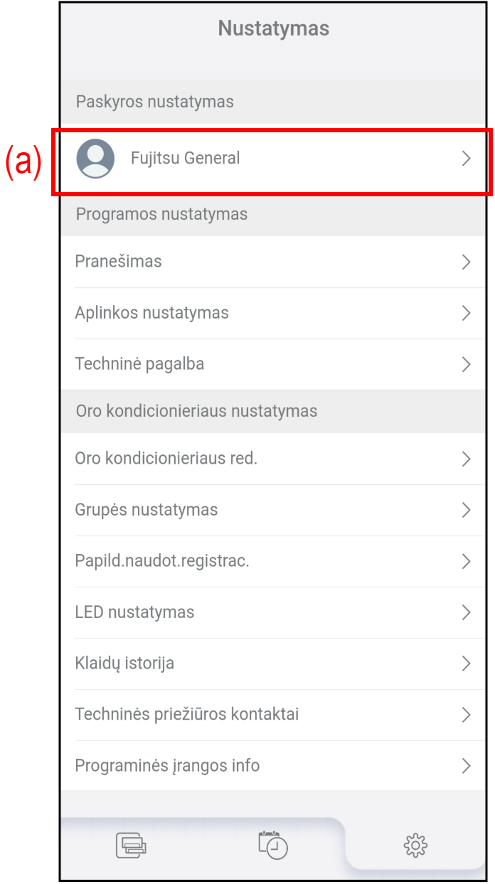 Norėdami pakeisti savo paskyros informaciją ir slaptažodį, nustatymų ekrane „Nustatymas“ bakstelėkite (a).
