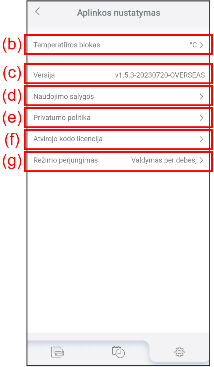 (c) Versija Parodo dabartinę „AIRSTAGE Mobile“ versiją. (d) Naudojimo sąlygos Bakstelėkite, kad susipažintumėte su naujausiomis „AIRSTAGE Mobile“ naudojimo sąlygomis. (e) Privatumo politika Bakstelėkite, kad patikrintumėte naujausią AIRSTAGE Mobile privatumo politiką. (f) Atvirojo kodo licencija Bakstelėkite, kad susipažintumėte su AIRSTAGE Mobile Atvirojo kodo programų licencijomis. *Atvirojo kodo programų licencijos rodomos tik anglų kalba. (g) Režimo perjungimas Bakstelėkite, kad pakeistumėte valdymo režimą (debesijos valdymo režimas arba tiesioginio valdymo režimas).