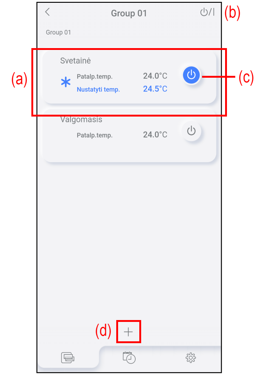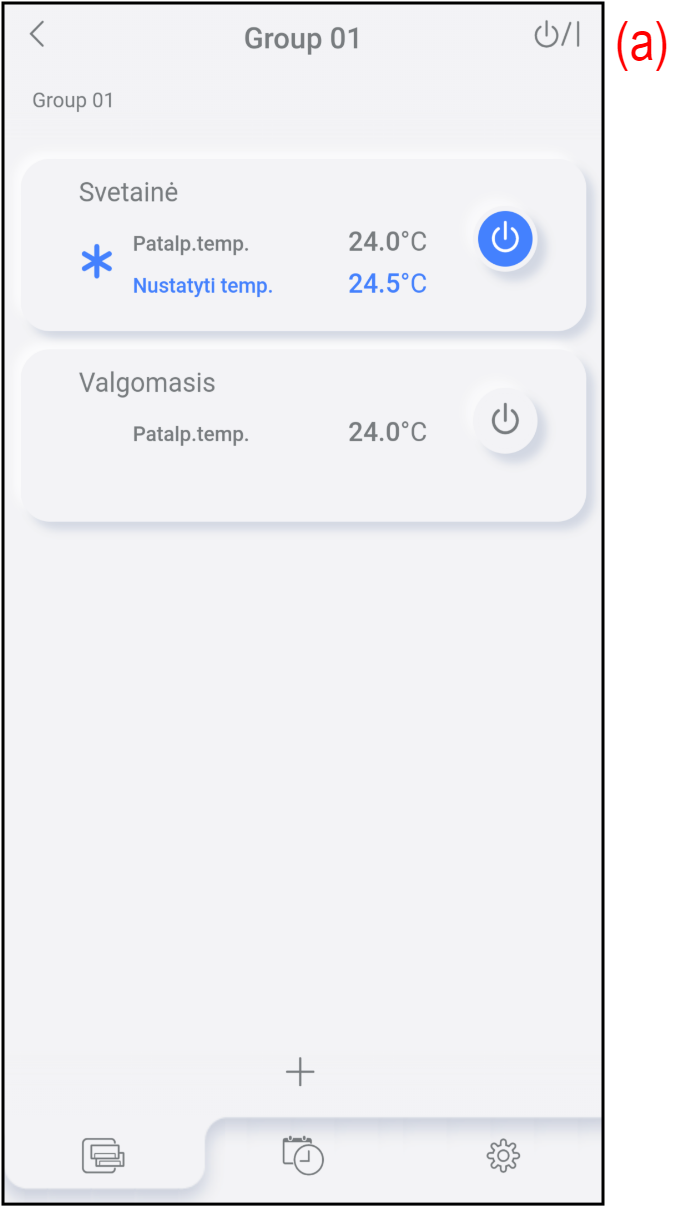 Norėdami paleisti / sustabdyti visų grupės oro kondicionierių veikimą, bakstelėkite (b). Daugiau informacijos žr. „Visi paleidimo / sustabdymo veiksmai“.