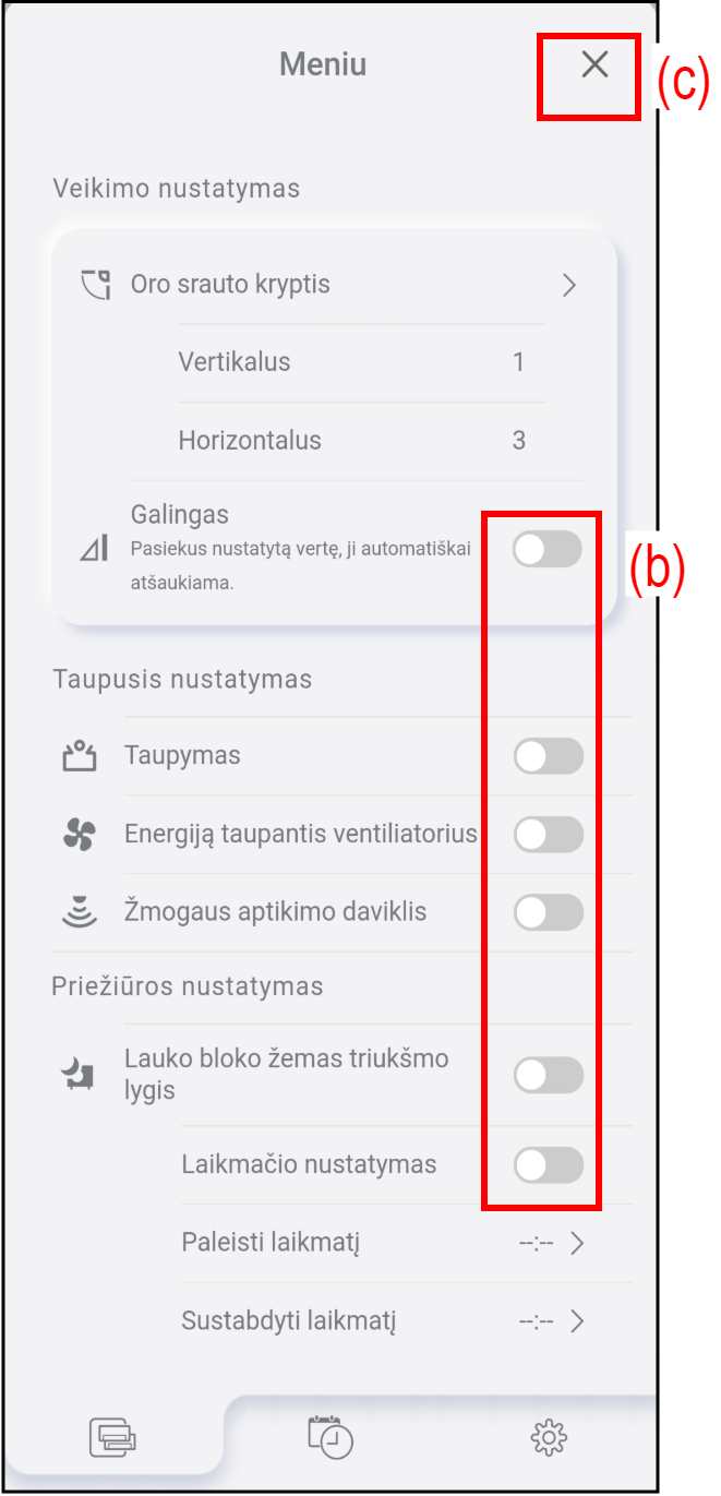 Bakstelėkite (b), kad įjungtumėte / išjungtumėte kiekvieną funkciją.