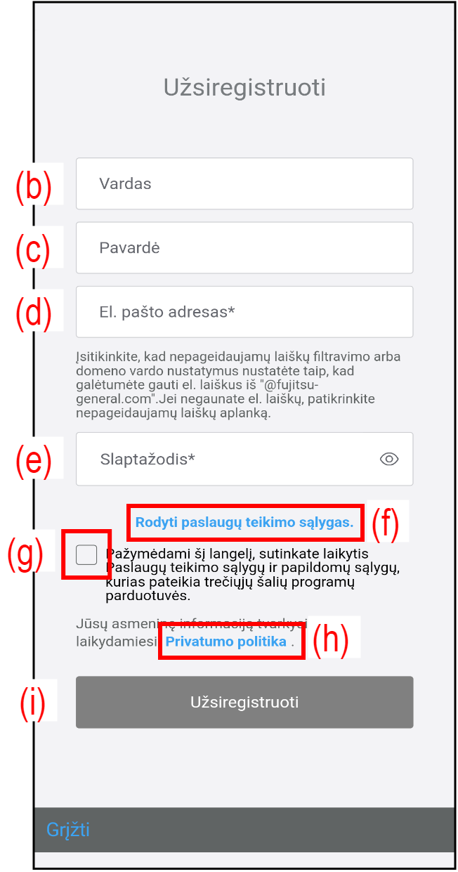 | (e) | Slaptažodis | Įveskite pasirinktą slaptažodį, susidedantį iš raidinių ir skaitinių simbolių. |