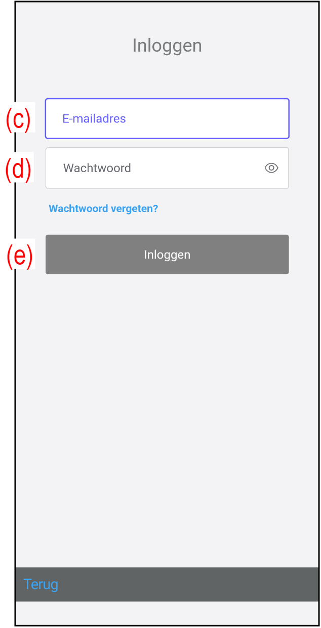 - Meld u aan met het e-mailadres (c) en het wachtwoord (d) dat u hebt geregistreerd.