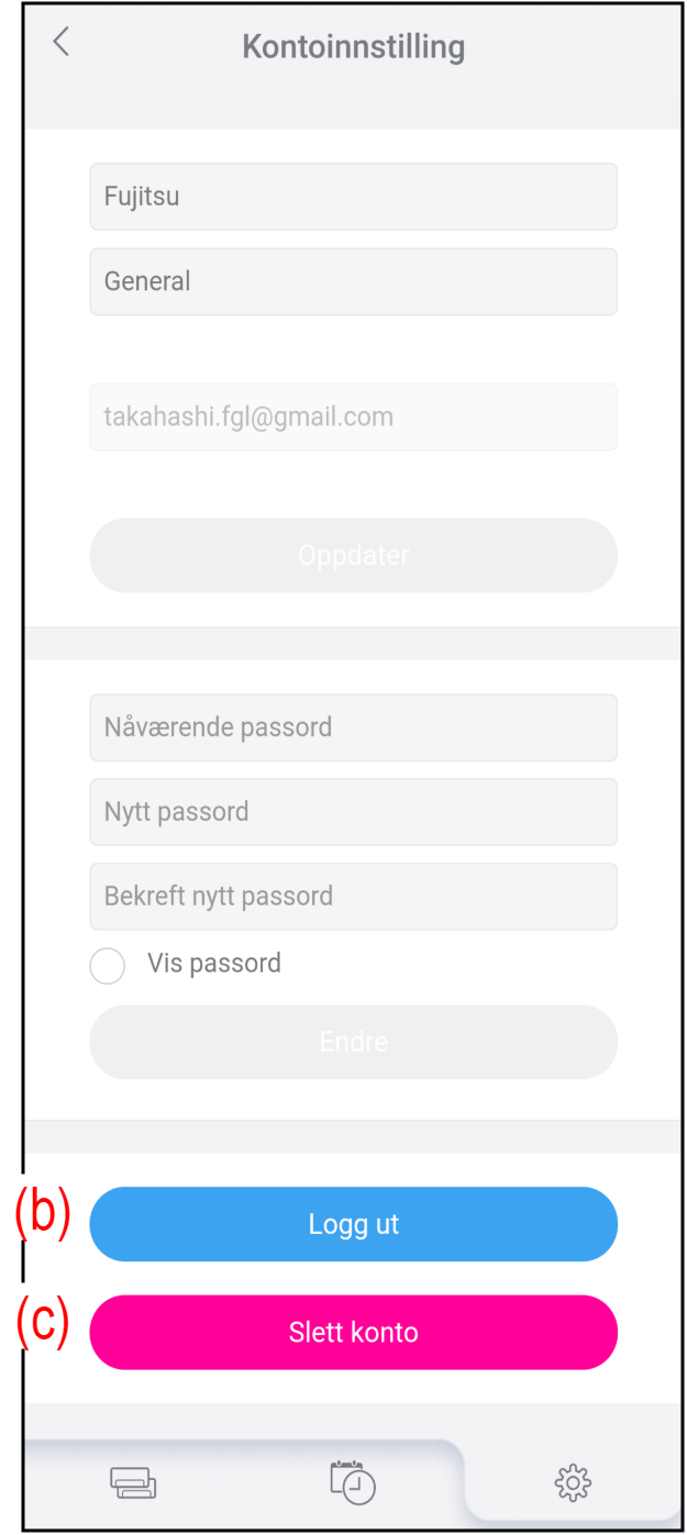 For å slette kontoen din fra denne appen og AIRSTAGE Cloud-serveren må du trykke på knappen (c).