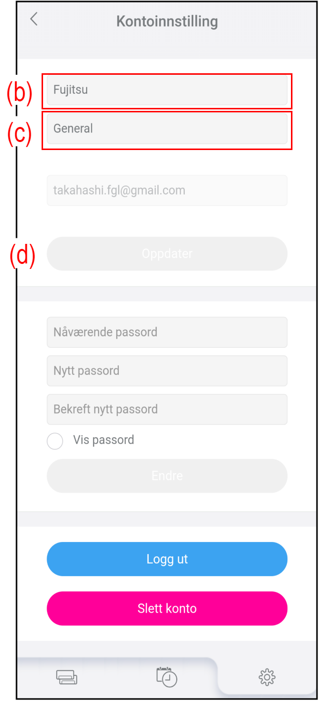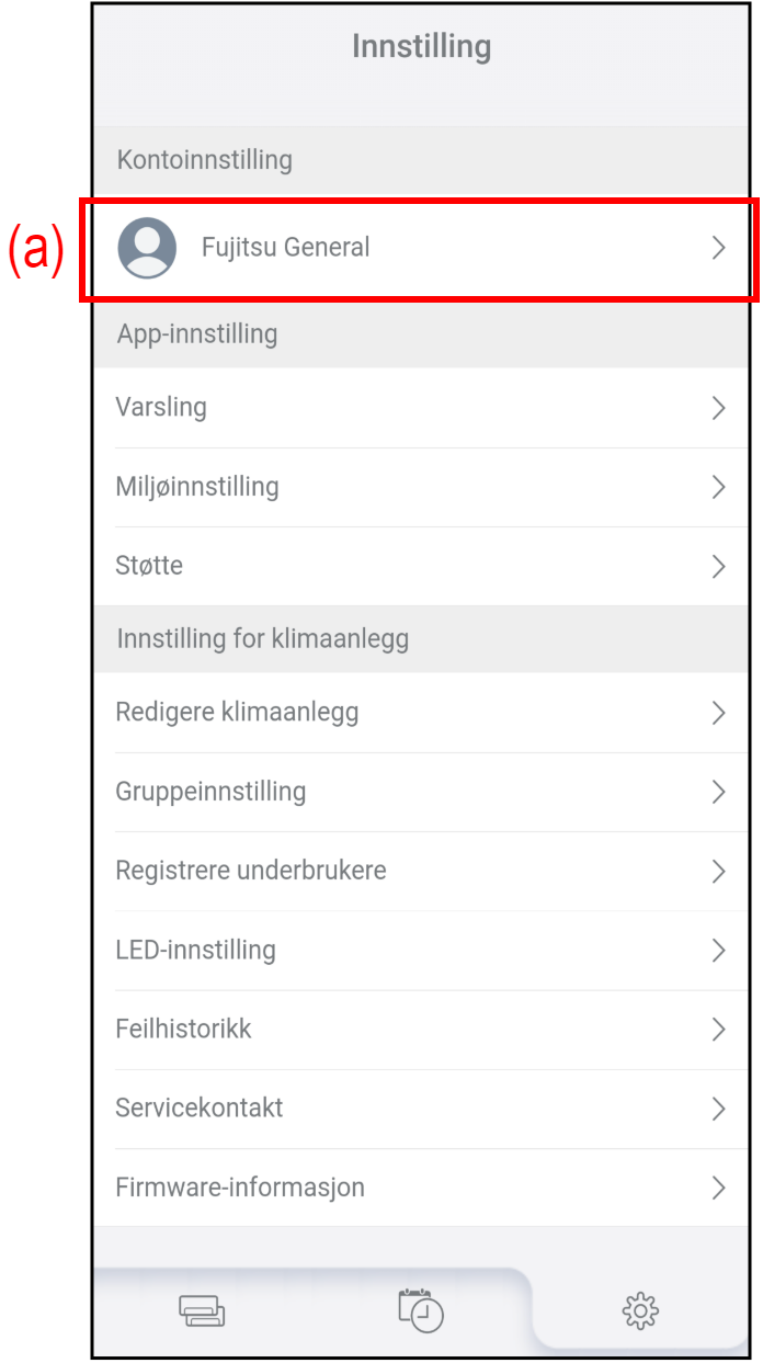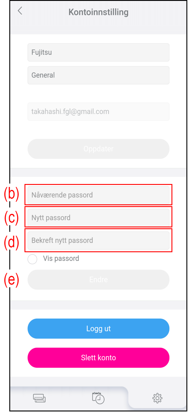 Trykk på (a) på «Innstilling»-skjermen for å endre kontoinformasjon og passord.