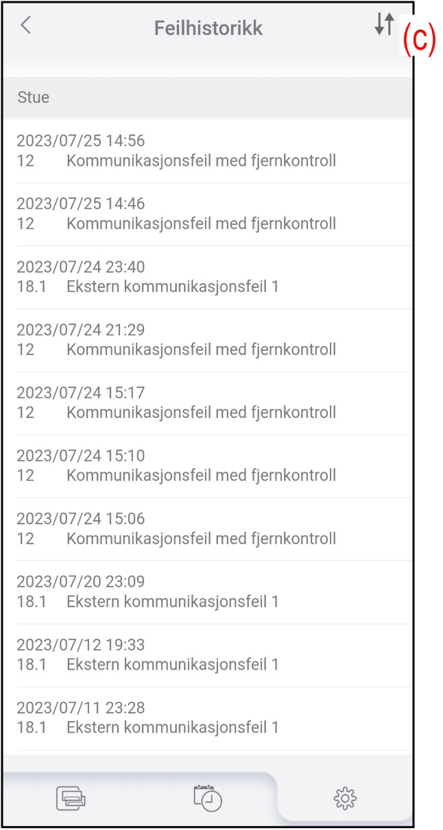 - Klimaanleggets feilhistorikk vises i rekkefølgen fra nyest til eldst.