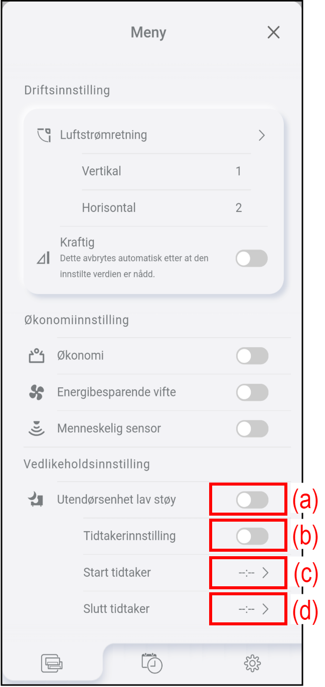 | (d) | Slutt tidtaker | Trykk for å stille inn sluttiden til timeren for stillegående drift for utendørsenhet. Stillegående drift for utendørsenhet stopper til angitt tid. |