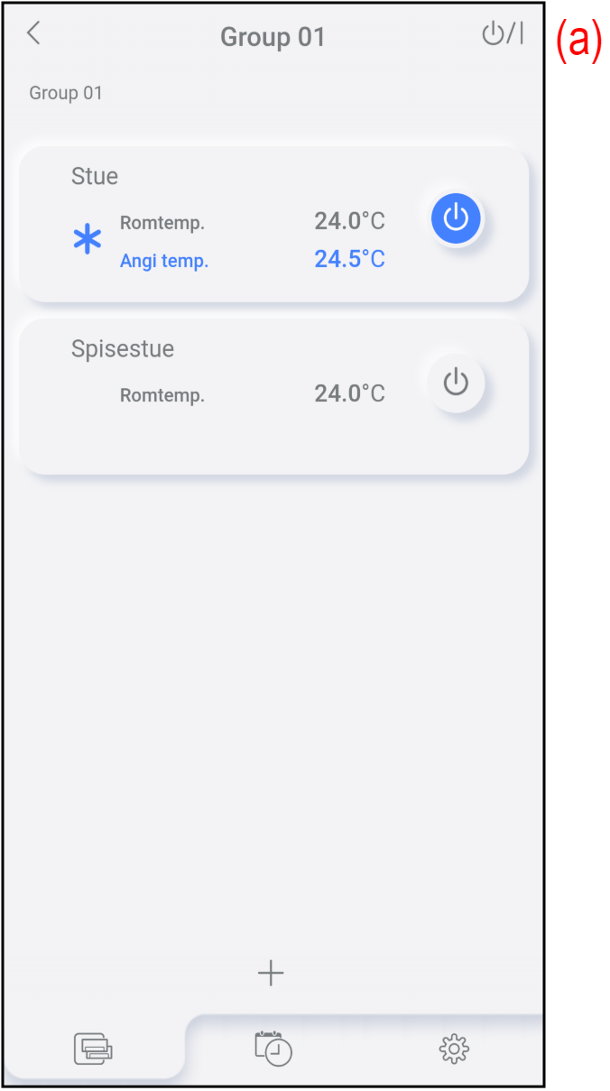 Trykk på (b) for å starte/stoppe driften av alle klimaanlegg i gruppen. Se «Start/stopp drift av alle» under for detaljer.